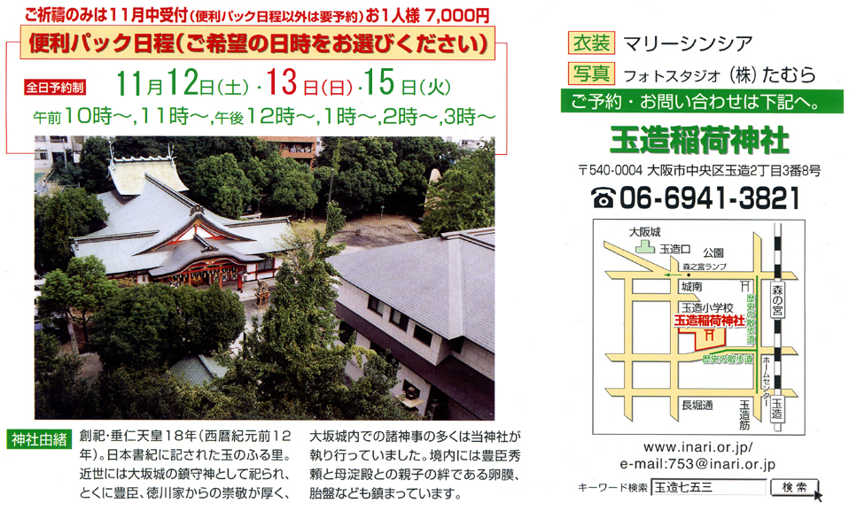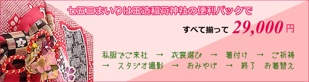 | (ハ) | ■パックのお写真サイズはキャビネ版となっております。(台紙付) ■女子の髪のセットは別途5,400円にてお受けしております。(パックにリボン髪飾りは付いております) ■当日、足袋と下着、タオルをご持参下さい。 ■衣装小物は当日150点以上の中からお選びいただきます。 |
