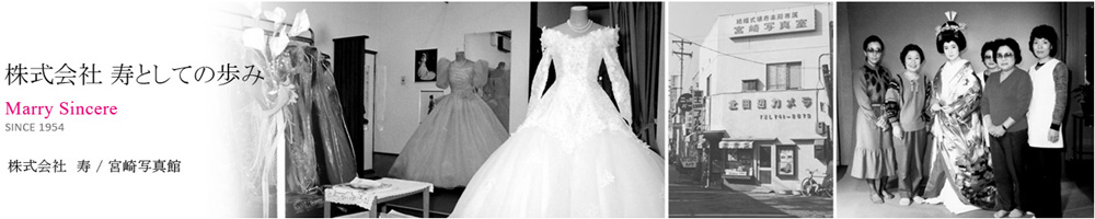 昭和29年大阪に地元から愛される「宮崎写真館(のちに寿貸衣装店)」として設立しました。婚礼衣装だけでなく、