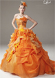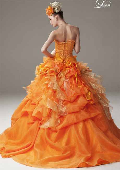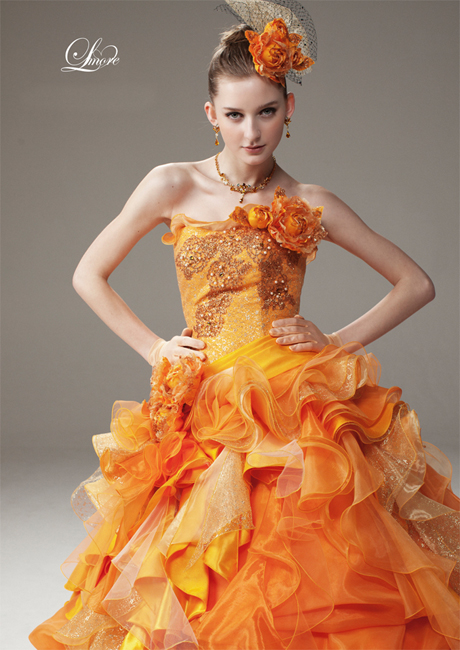 ビタミンカラーのオレンジドレスは明るく元気な印象に。幼さを払拭するために見頃には豪華なゴールドの刺繍が施されています。