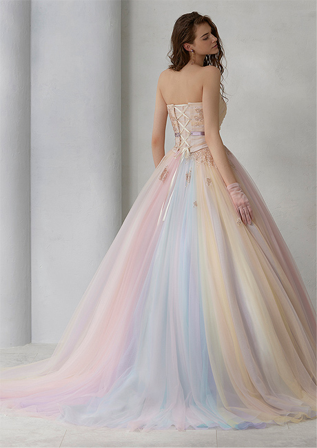 珍しいレインボードレスは見る角度によって表情を変えます。”レインボー”は可愛い印象を持たれますが、チュール素材、少し淡くさせた色見が大人っぽい1着に。