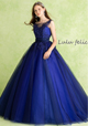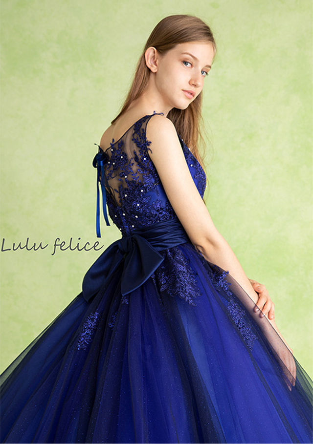 色鮮やかな深い青が目を惹く高級感あるカラードレス。身ごろからウエストにかけてカットレースが施され、ウエストリボンが愛らしさを演出。