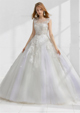 アンティークな刺繍が愛らしく、優しい印象のドレス。シルエット、オフショルダーが体型をカバーしたい方にお勧めの1着です。