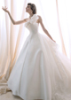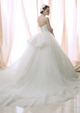 ドレス正面はシンプルなサテン地のAライン。バックスタイルはチュールを用いた二面性のあるウエディング。