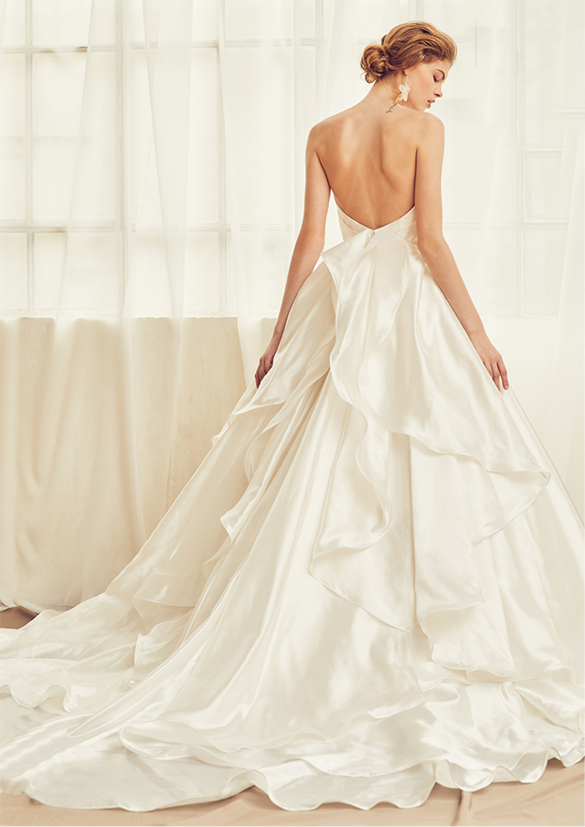 サテン地の高級感あるウエディングドレス。張りだけじゃなく、生地を幾層にも重ねることで独特のLINE を出しています。身ごろデザインも特徴的で、ドレス単体でデザイン性あふれる一着に。