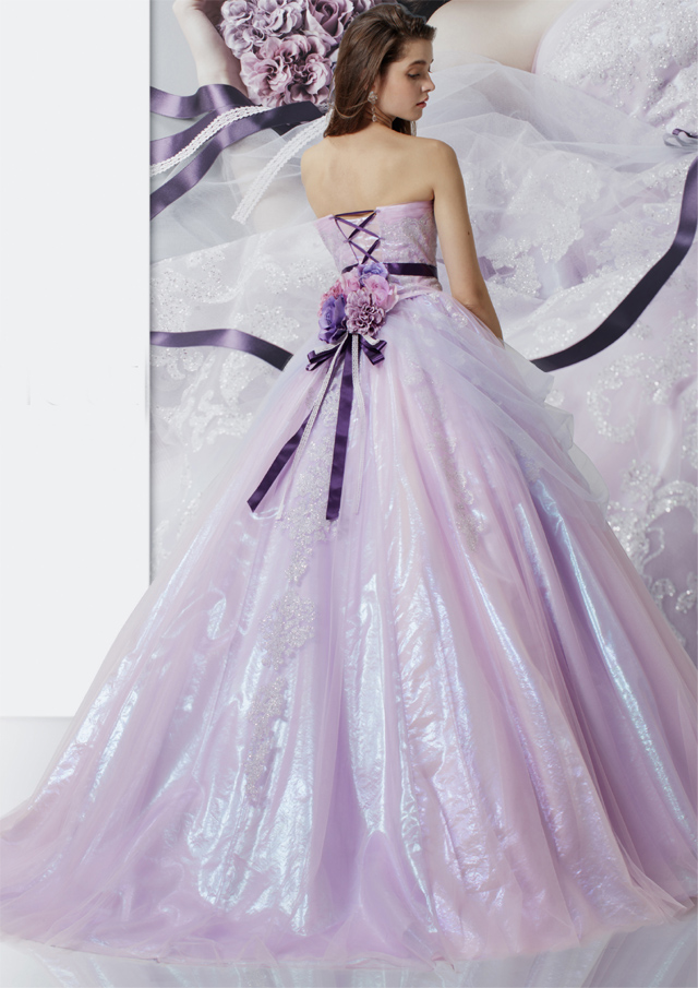 ESTIQUEブランド。クラシックな印象に、モードテイスト、ジャパニーズモダンも融合させた新しいジャンルを表現。ほんのり色気が漂うラベンダーカラーが上品な花嫁を演出。