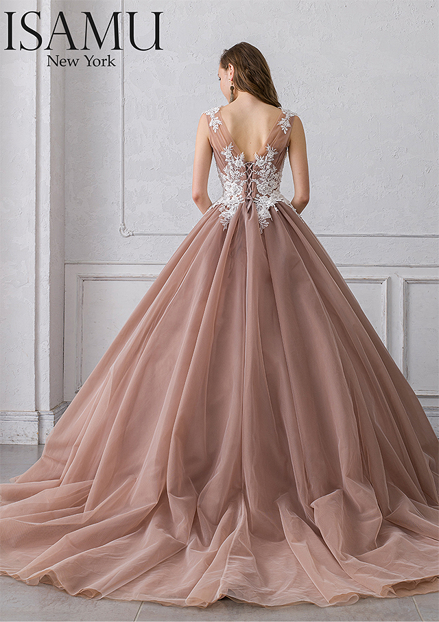 ISAMU MORITAブランド。ラグジュアリーなカットレースを身頃にあしらい、スカート部分はナチュラルなチュールでまとまった1着。珍しいモカカラーのカラードレスは飾り過ぎない大人のドレスです。