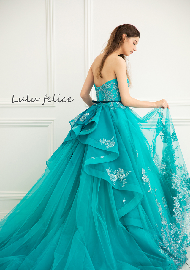 LuLu felice(素敵な幸せ)。 深みのある色合いと身ごろと裾にあしらわれた上品なグリッターが美しいブルーグリーンのカラードレス。高級感と華やかさを併せ持った一着。