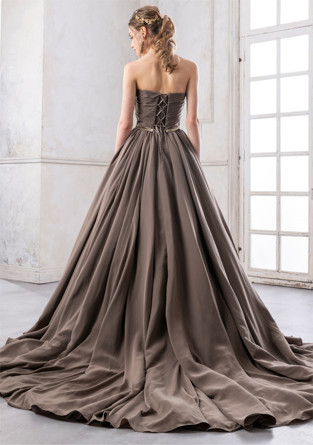 高級なコスチュームに使用される、デシン素材を贅沢に使用し、独特の素材感とドレープ感を表現された1着。 ウエストにあしらわれた、シルクベルベットのベルトが、ドレス全体を引き締めるデザインポイントに仕上がっています。