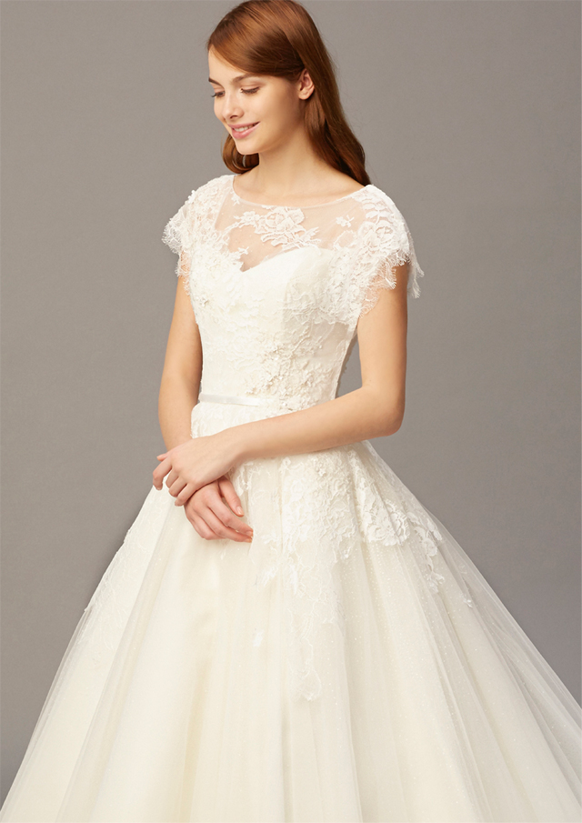 最近人気のオフショルダータイプの優しいドレス。アンティークさもありながら、トレンドは外さないこだわりの1着です。
