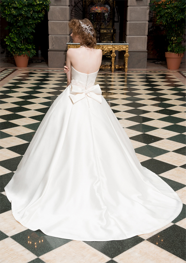 大きくカットされた見頃はまるで、花嫁を花束に見立てたような1着に。切り返しの着いたトレーンで重厚な式場にもピッタリのドレスです。