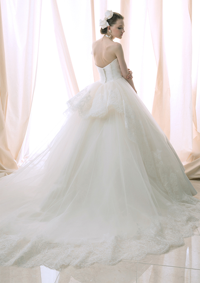 ドレス正面はシンプルなサテン地のAライン。バックスタイルはチュールを用いた二面性のあるウエディング。