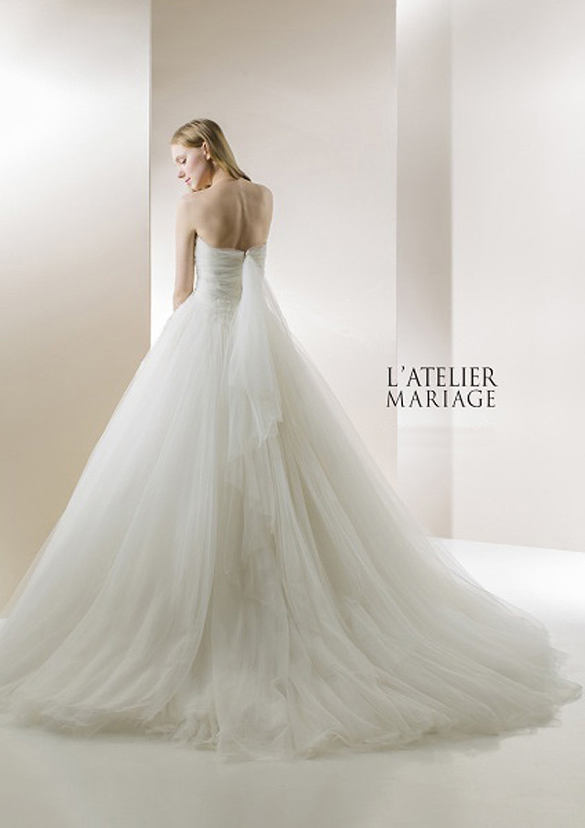 シンプルなAラインドレス。大きく広がったスカート、柔らかいチュールの素材感を存分に演出した透明感あるドレスです。