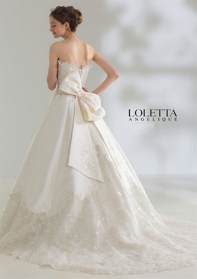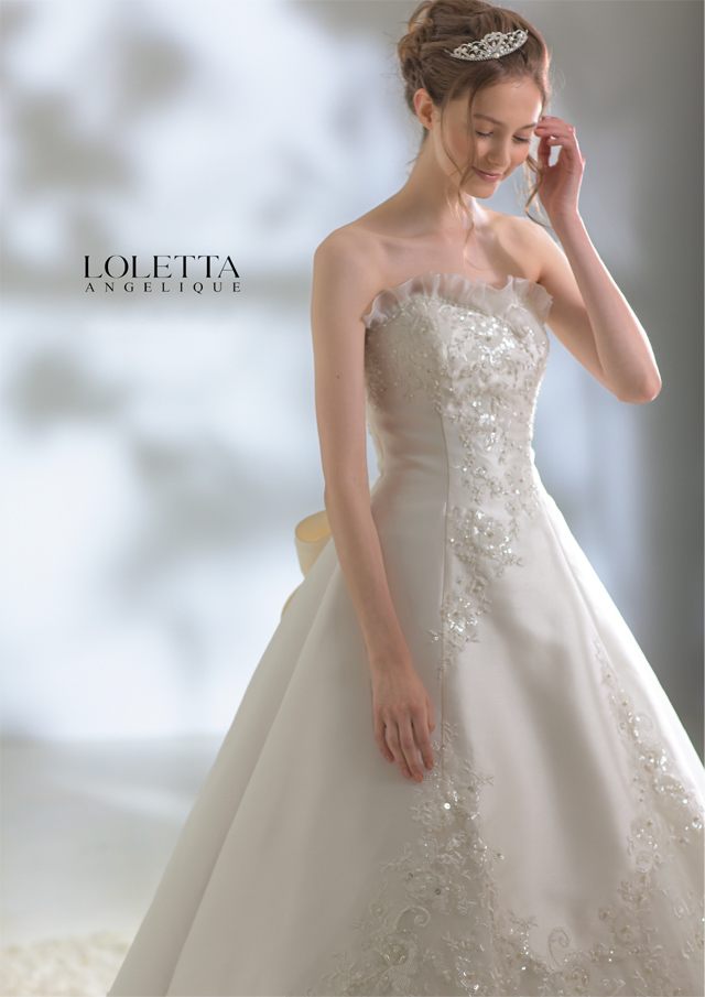 シルエットが美しいAラインのドレス。ロングトレーンの切り返しが付いており、挙式と披露宴では違った印象を与える1着です。