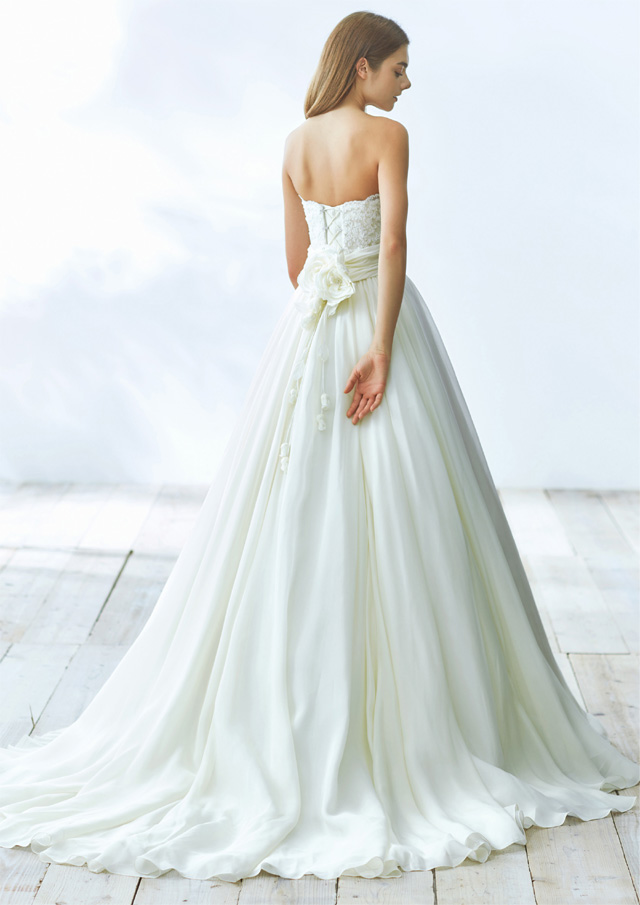 ジョーゼット生地の素材が持つナチュラルでエレガントな雰囲気をそのままに、見頃にはカットレースを用いてシンプルな中に可憐さも備えた1着です。