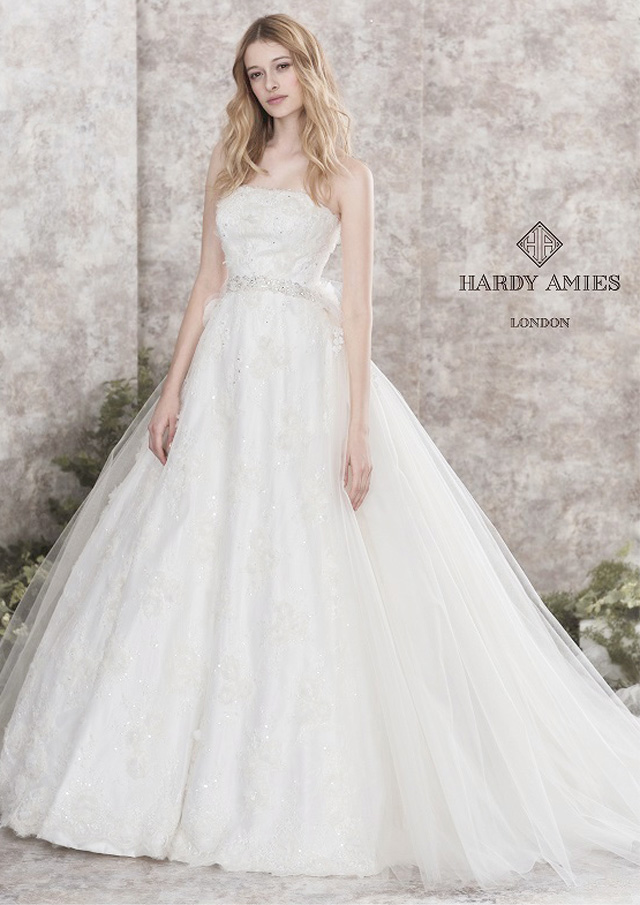 抜け感のあるイメージですが、王道のAラインにカットレースを散りばめられた高級感のある1着。ウエスト部分にビジューを用いることでより美しいラインでご着用いただけます。