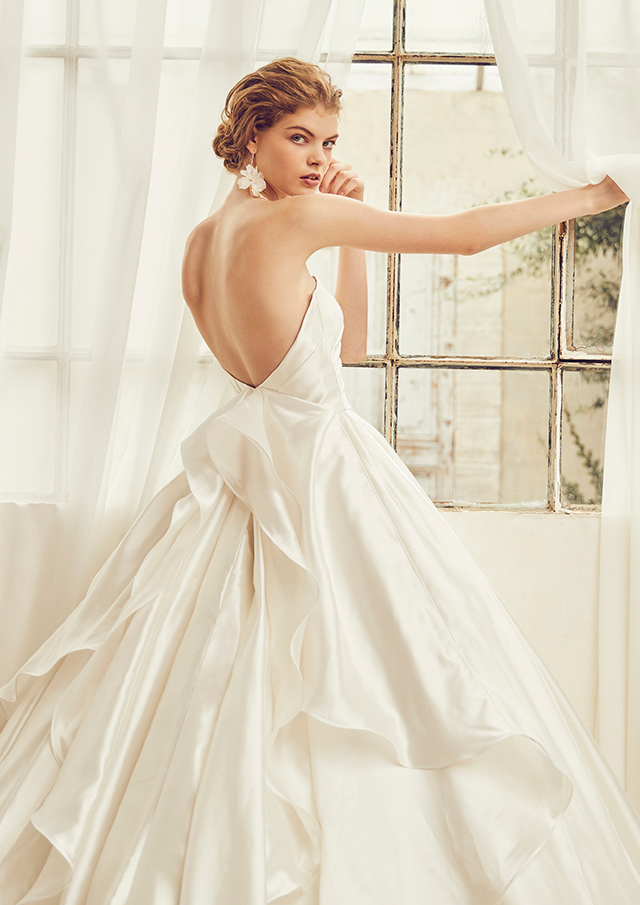 サテン地の高級感あるウエディングドレス。張りだけじゃなく、生地を幾層にも重ねることで独特のLINE を出しています。身ごろデザインも特徴的で、ドレス単体でデザイン性あふれる一着に。