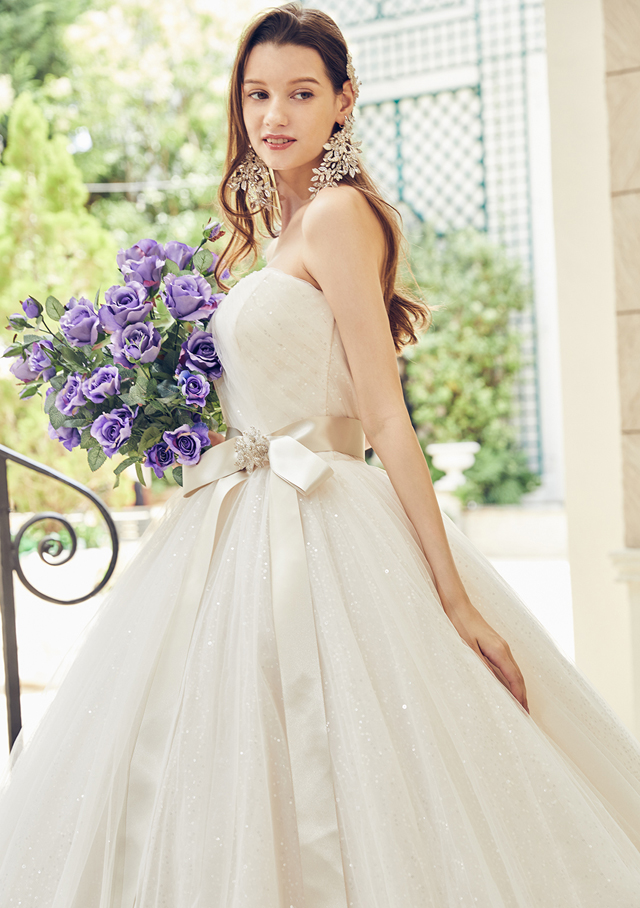 王道のプリンセスラインドレス。シャンパンカラーのサッシュベルトで華やかさと、ボリュームあるスカート部分を強調してくれます。