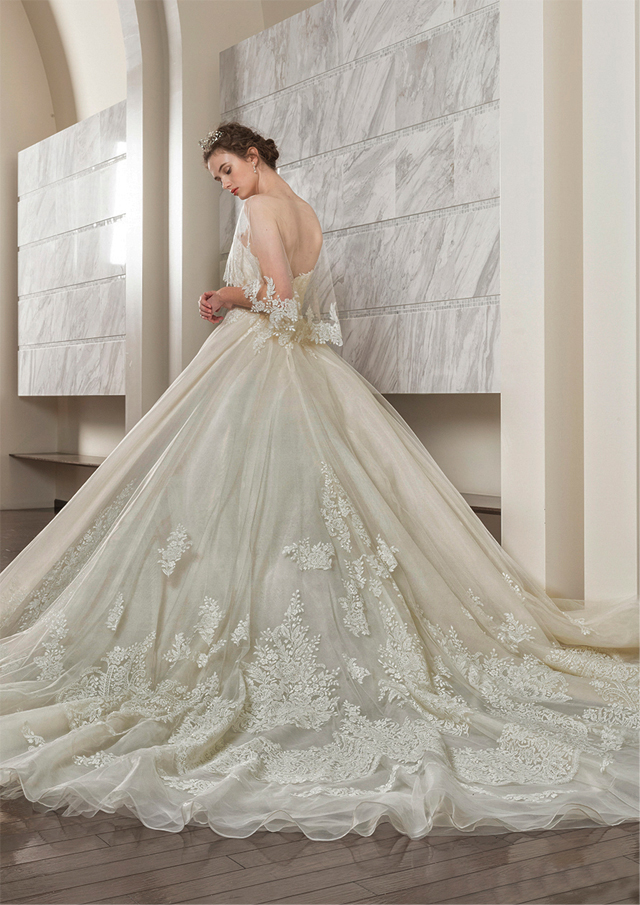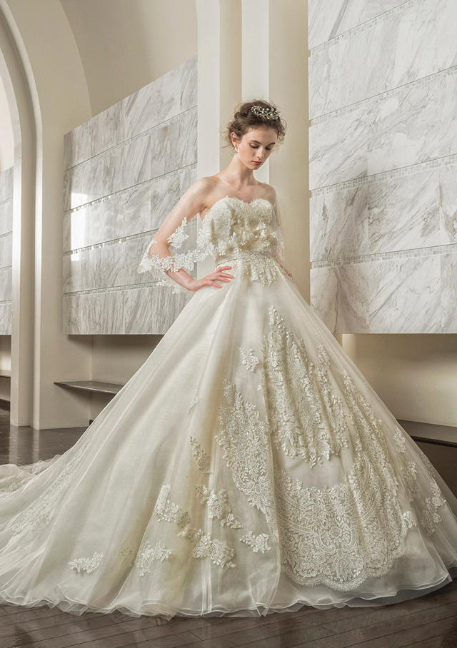 大きなスカラップ調のグリッターレースが目を惹くクラシカルなウエディングドレス。