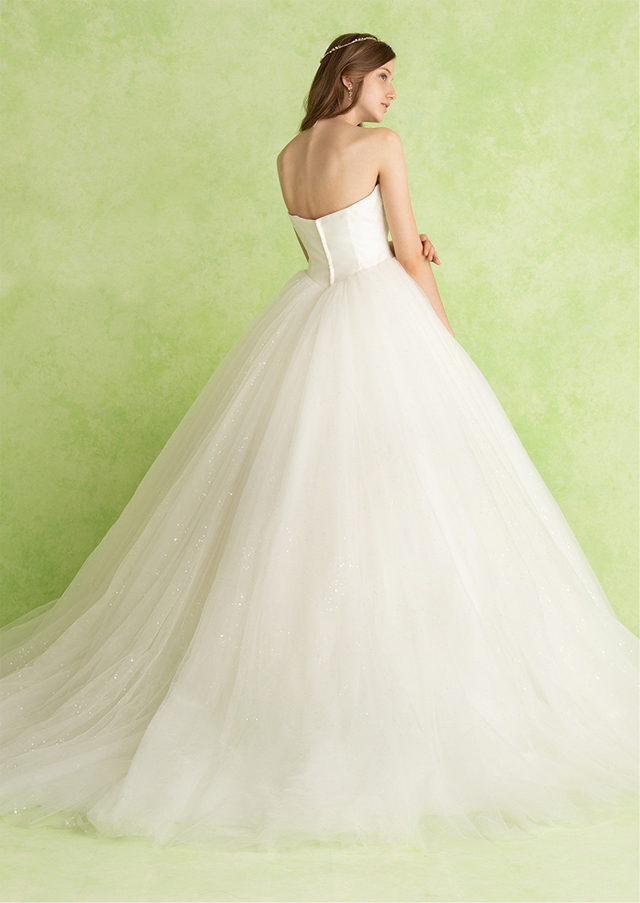 チュール素材に無数のスパンコールが散りばめられたエアリー感のあるロマンチックな1着。