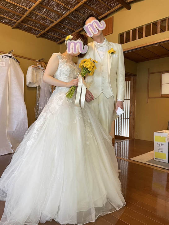 昨日、無事に結婚式を終えることができました! 衣装もとてもかわいく、実際に見て選んでよかったです✨ 和装も洋装もどっちも綺麗で、着てよかったです!前撮りからご対応いただき、本当にありがとうございました🙇