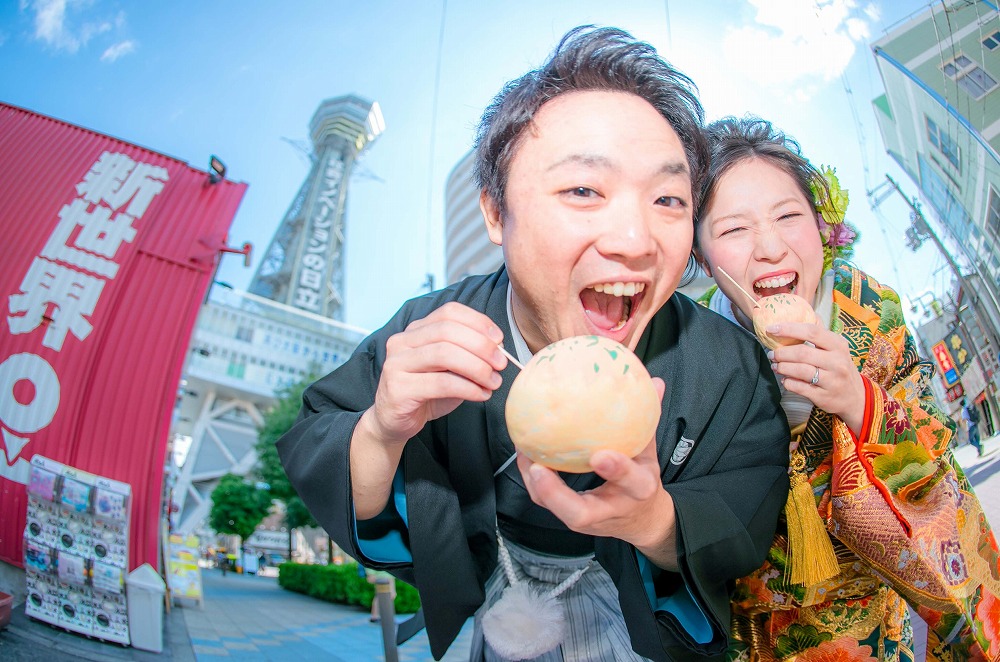 大阪らしい写真が撮りたい。というお二人のご要望で新世界での撮影。